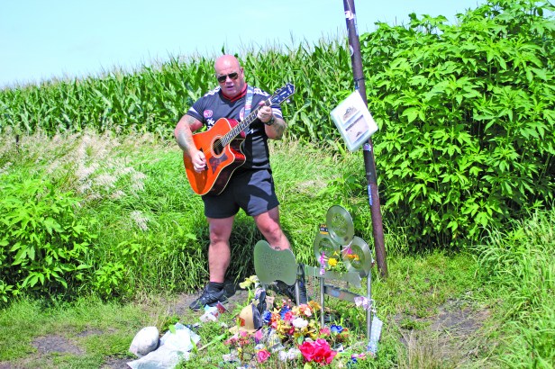 Sherry laid some flowers beneath the stainless-steel guitar and records, alongside the other tributes left, including a few pairs of glasses, two trucker hats, flowers and many coins on the small ledge beneath the records. She stepped back after, to take it in once again and share a few hugs with the friends that surrounded her.